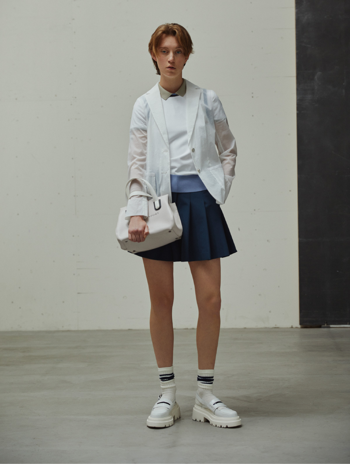 今年の夏はスクールガールスタイルに注目。トレンドの透け感のあるジャッケットには襟付きシャツ&ベスト、シックな印象のネイビーのプリーツ風のキュロットを組み合わせるとフレッシュなスクールガールスタイルが完成。ジャケットの袖からさりげなく透ける肌が軽やかな印象を演出。上品な大人のスクールガール風コーデが視線を集めるかも。